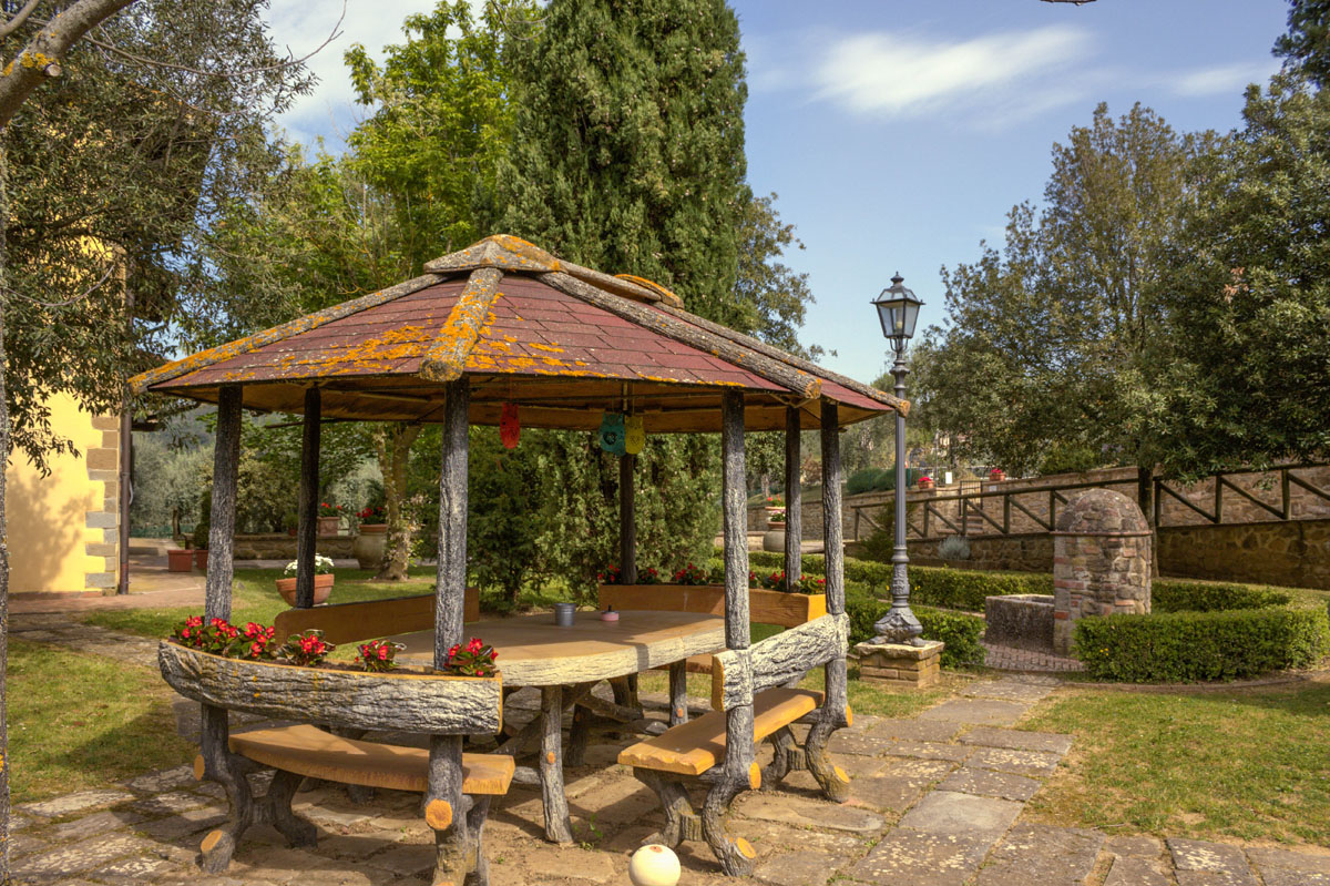 Möblierter Außenbereich (Holz-Pavillon), feststehende Stühle und Tisch, gemauerter Grillplatz und überdachte Terrasse